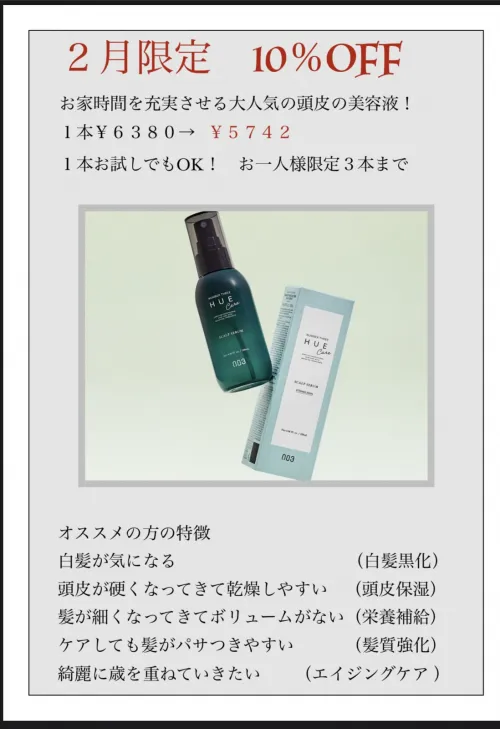 こんにちはNobleです。今話題の頭皮用エッセンス!ヒュウケアスカルプセラムが2月限定で10%OFFに