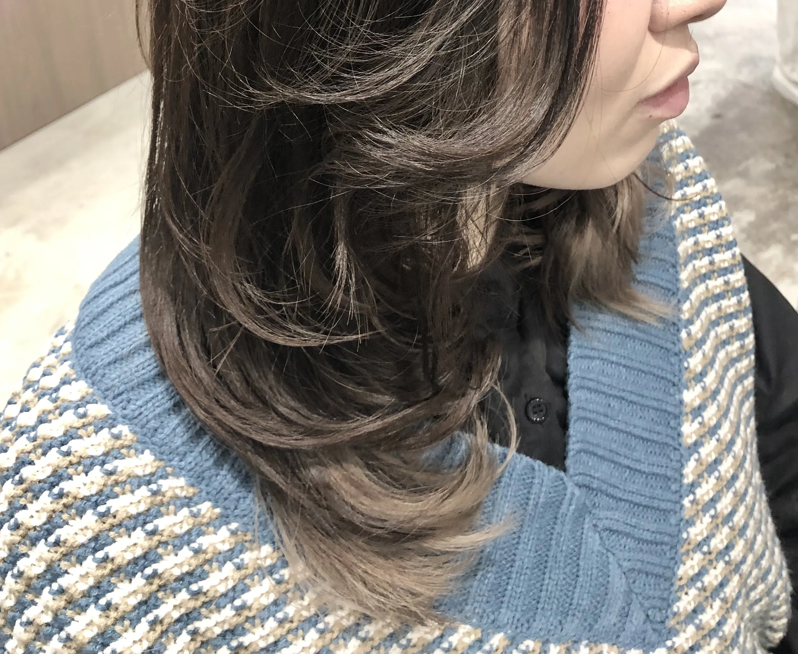 前回ブリーチしたインナーの部分を再利用して一色染め。ちょうどいい大人のグレージュになりました!